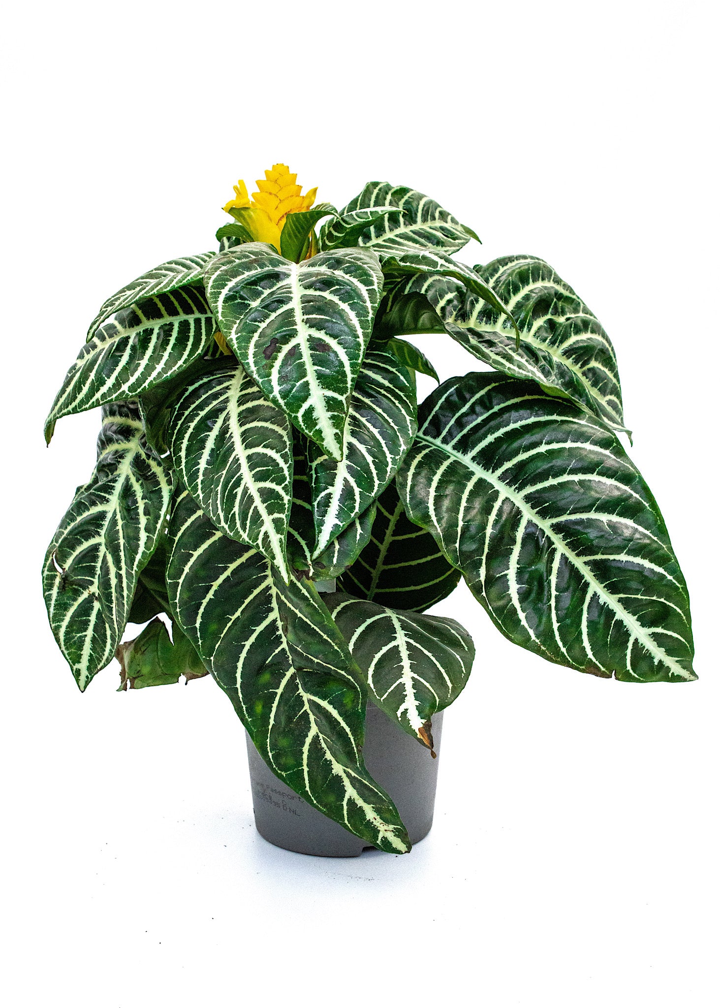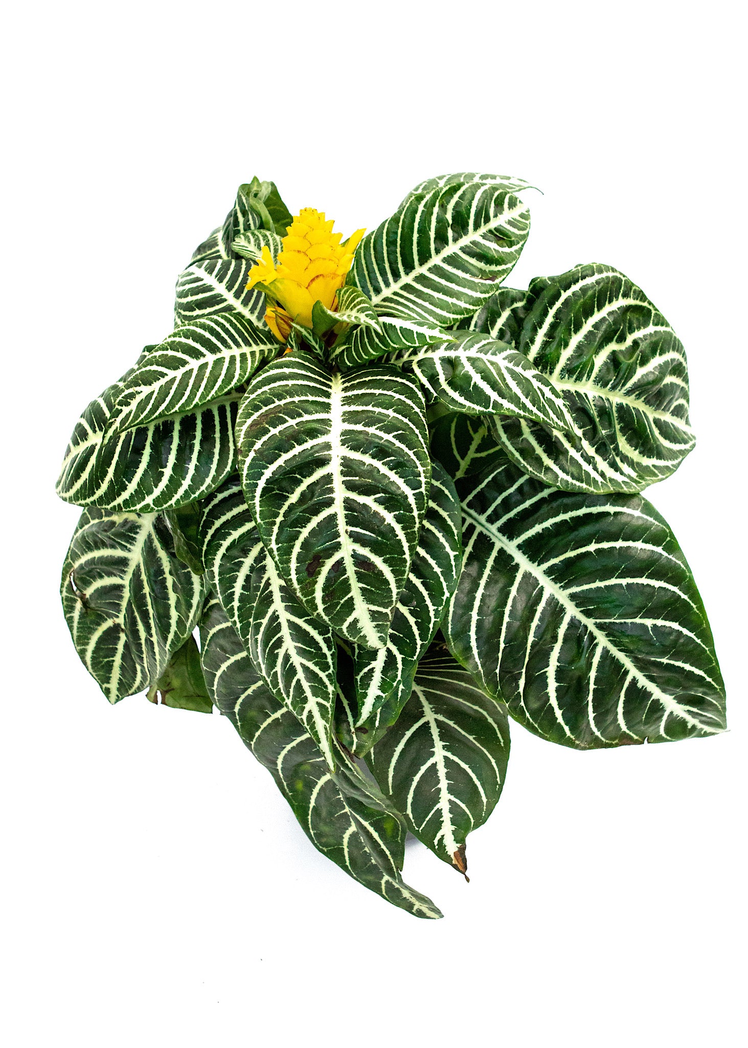 Aphalendra Squarrosa, also known as Zebra Plant or Saffron Spike, is named for its glossy green leaves marked with bold white veins – similar to a Zebra’s stripes. In its tropical home of Brazil, this plant grows into a 4 foot tall shrubs. As a houseplant, you can expect heights of around 15 to 24 inches.