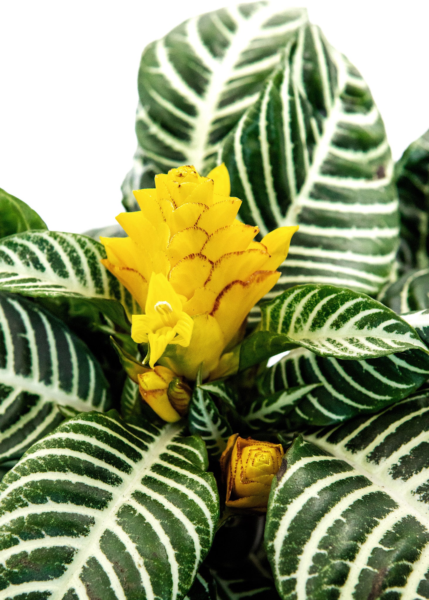 Although prized for its attractive foliage, the Zebra Plant also produces beautiful flowers when given proper care. A happy plant blooms in late summer to fall, producing delicate yellow flowers that emerge from clusters of yellow bracts. Flowers last several days, and bracts last up to six weeks. Luckily, when we did our shoot for the Zebra Plants they were flowering not with 1 flower but with 3 flowers and 7 other buds. Magical!