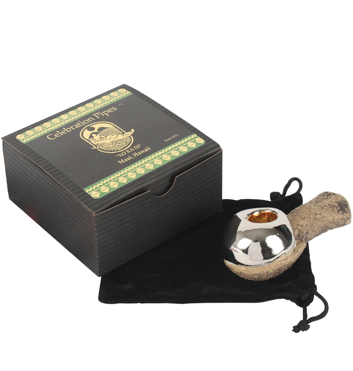 The beautiful Platinum layered pipe is a very popular model of our CELEBRATION PIPES™ line. CELEBRATION PIPES™ are "NO KA OI"....the very best. Each pipe is handcrafted, signed, and fired to over 2,350 degrees Fahrenheit, and plated in Platinum....the Platinum bowls reflect heat and completely burn whatever is inside of them....more "bang for the buck". The base is made from LAVASTONEWARE™, a unique compound created 38 years ago and hi tech in its heat ablating simplicity. Each gold plated pipe is encased in a velvet and satin handmade pouch for safekeeping. They also come complete with a certificate of authenticity signed by the artist in a gift box as a great presentation piece for gift giving.