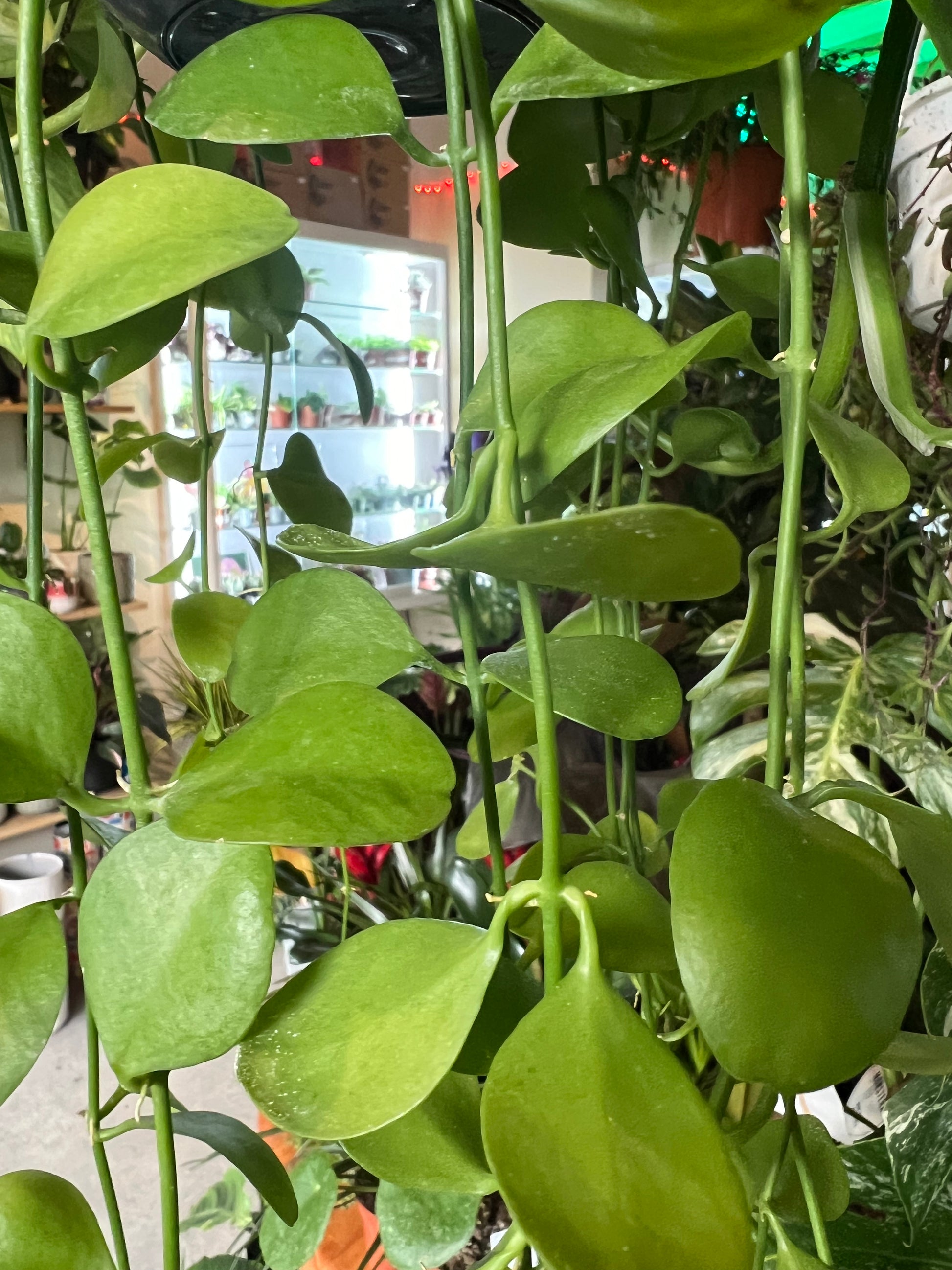 A beautiful, hanging houseplant. The Dischidia Oiantha showcases wonderful and unique leaves that are perfect for trailing down shelves or walls. It's native to the rainforests of Asia where it grows as an epiphyte, trailing over various trees. It's relatively easy-going and will brighten up any space.