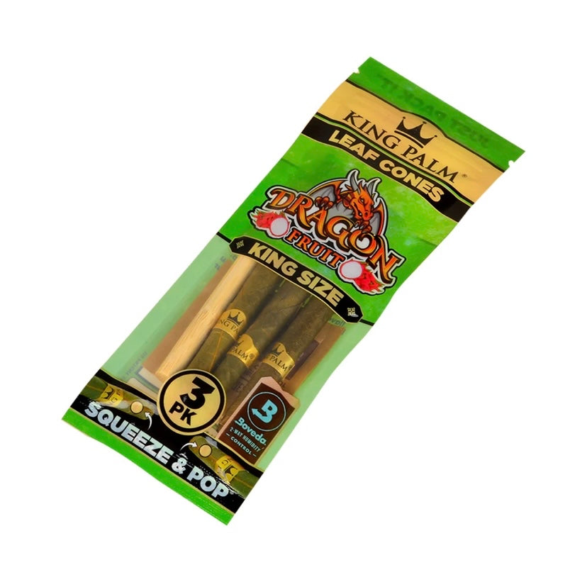 King Palm’s signature pre-rolled palm leaves are now available in a cone shape! Instead of a straight tube-like classic King Palms, these cones are tapered down to the filter tip and wider at the top. The King size is a standard cone size that is 109mm. Each filter contains a flavor bead to squeeze and pop to activate the flavor. Each individual pack includes 3 cones. Each holds a gram.